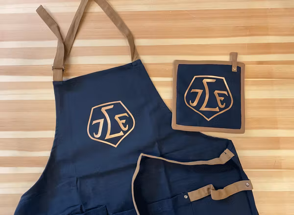 Förkläde i 100% bomullsduk (300 g/m²) med metalldetaljer.Med 3 multifunktionella fickor och en sidolist (för att hänga en kökshandduk).Lätt justerbar nackrem. 6